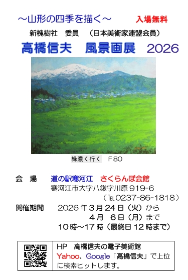 高橋信夫 風景画展2026 ~山形の四季を描く~ 【日時】2026年3月24日(火)~4月6日(月) 10:00~17:00(最終日12時まで) 【場所】道の駅寒河江 さくらんぼ会館 〒990-0523 山形県寒河江市八鍬字川原919-6 (TEL 0237-86-1818) 入場無料 案内状の印刷用PDFはこちらから